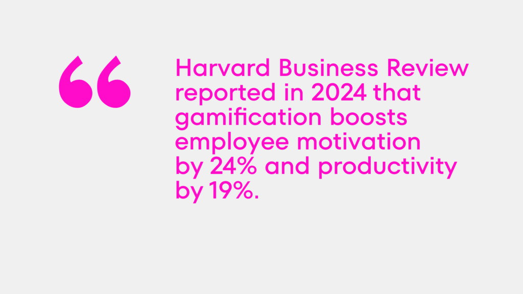 Gamification research from AmplifAI (2026) confirms this: organizations with the right gamification elements in place see a 50% rise in workforce productivity and a 60% increase in employee engagement. Harvard Business Review reported in 2024 that gamification boosts employee motivation by 24% and productivity by 19%. And 83% of employees who receive gamified training feel motivated at work, compared to only 61% of those receiving non-gamified training.