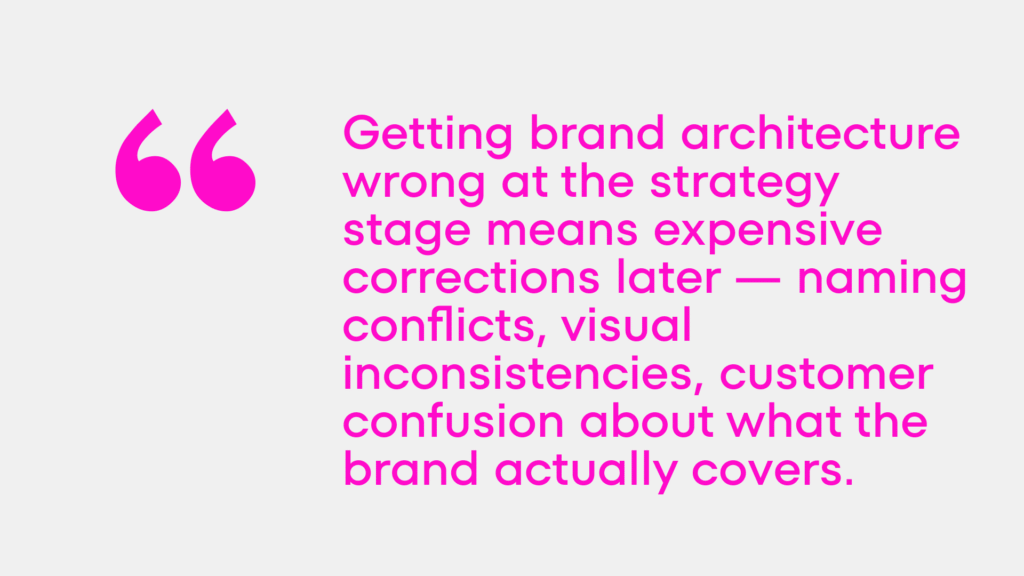 This matters operationally. Getting brand architecture wrong at the strategy stage means expensive corrections later — naming conflicts, visual inconsistencies, customer confusion about what the brand actually covers.