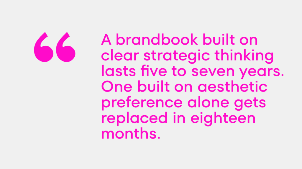 A brandbook built on clear strategic thinking lasts five to seven years. One built on aesthetic preference alone gets replaced in eighteen months.