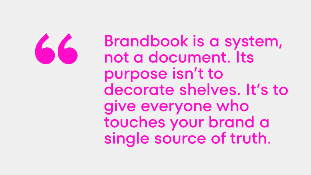 This is a system, not a document. Its purpose isn’t to decorate shelves. It’s to give everyone who touches your brand — internal team, external agencies, freelancers, contractors — a single source of truth. One rulebook. No interpretations.