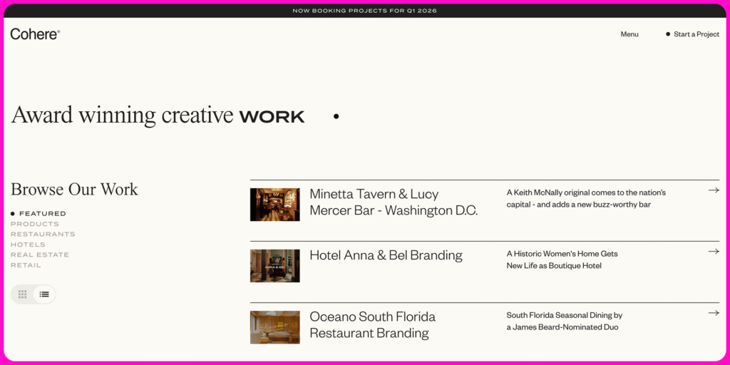 Cohere is a boutique creative agency founded in 2007 and headquartered in Philadelphia, with additional offices in Baltimore, Princeton, New York City, and Miami. They specialize in branding and marketing for the hospitality, food, and real estate sectors, crafting experiences that connect deeply with local communities.